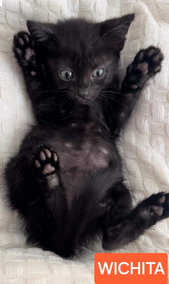 Chula, petite chatonne toute noire au regard bleu envoûtant, est la douceur incarnée. Toujours collée à l'humain, elle se faufile partout, adore s'installer confortablement dans les capuches de sweatshirt. Elle tisse des liens forts avec sa sœur Wichita et même avec nos fidèles chiens, se blottissant entre leurs pattes pour une nuit bien au chaud.