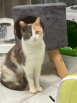 Honey est une jeune chatte tricolore dont l'âge est estimé à 18 mois. Elle a le poil court et sa robe très particulière nous donne l'impression qu'elle porte un masque