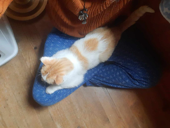 Oural est très très très câlin. Il aime les papouilles et les genoux (preuve en photo !), il se frotte contre les jambes, contre vous... Il fait même des câlins avec sa tête ? Cependant, ce n'est pas un chat peluche, il n'aime pas être contraint (être dans les bras par exemple) ni les gestes brusques et de vieux réflexes de chat de rue peuvent ressurgir, il faut donc une famille compréhensive, qui le laisse guider les câlins (et il en raffole ça c'est sûr !) et le rassure.