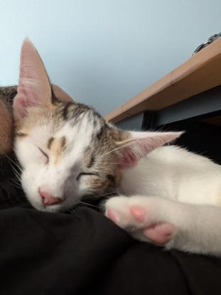 Quand cette boule d'énergie a besoin de se ressourcer, il adore se lover dans nos bras ou sur nos genoux pour un petit moment de câlins. Quand nous ne sommes pas disponibles, il part se lover contre un chat.