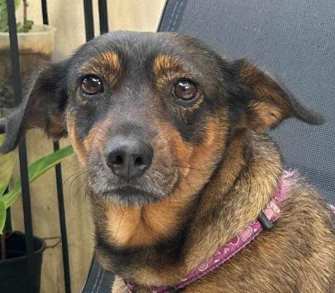 Mirabelle est arrivée de l'île de la Réunion. Elle est âgée de 3 ans et pèse 10 kilos. Elle est courte sur pattes avec un corps de teckel.