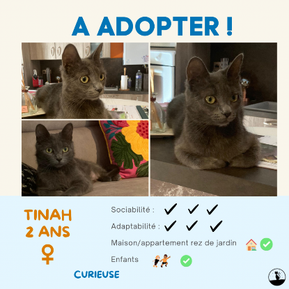Nous vous présentons la jolie Tinah, une toute jeune minette adulte. Tinah est la maman de 5 beaux chatons, elle les a materné et a bien pris soin d’eux. Désormais, c’est à son tour de trouver sa famille adoptive et débuter sa nouvelle vie. En quelques mots, Tinah c’est une minette adorable, douce et gentille. Animée par une curiosité infinie, Tinah n’est jamais bien loin de son humaine et adore l’observer. Elle participe à toutes les activités, et adore notamment les moments de sieste pour ronronner de bonheur.