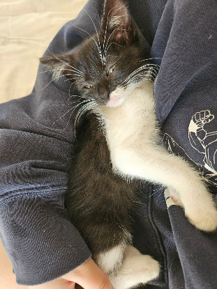 Petite femelle (250 26 95 91 01 36 83) noir et blanc née le 12/05/2024 a été abandonnée avec sa fratrie et sa maman elle est très câline et sociable.