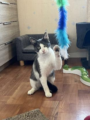 Je vous présente Zorro. Il a été trouvé dans la cour d'un particulier le 4 juin 2024. Il vivait en extérieur autour du quartier et revenait quand il était appelé. Après avoir suivi les règles de recherche de propriétaires, Zorro nous a été confié le 26 juin 2024. C’est un mâle stérilisé de type européen avec une robe blanc et gris d’environ 1 an.