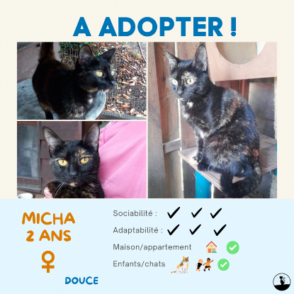 Pour décrire Micha en quelques mots clés : douce, gentille, affectueuse et sage. Micha est une minette adulte calme, et extrêmement tendre. Elle adore la compagnie des humains, et sera très pot de col avec vous à la maison. Elle vous accompagnera partout, pour vous observer, mais aussi pour ronronner juste en vous voyant. Micha se laisse porter, elle est très adaptable. Une chose compte pour elle : faire partie d’une famille. Elle vous offrira énormément d’amour et de beaux moments, c’est garanti !