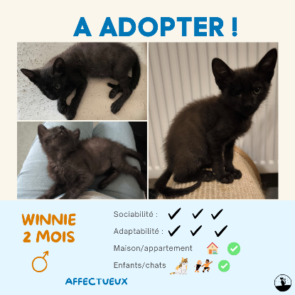 Winnie est un petit guerrier. Récupéré par l’association alors qu’il était tout petit, il s’est battu pour vivre. Ce chaton est exceptionnellement attachant et affectueux. D’abord très vif, il a une très bonne dose d’énergie qu’il investi dans les jeux. Si vous cherchez un chaton joueur, c’est Winnie qu’il vous faut ! Winnie est aussi un gourmand. Il vous fera fondre d’amour pour une friandise. Enfin, très câlin, il ne vous demandera pas votre permission pour se lover contre vous et ronronner.