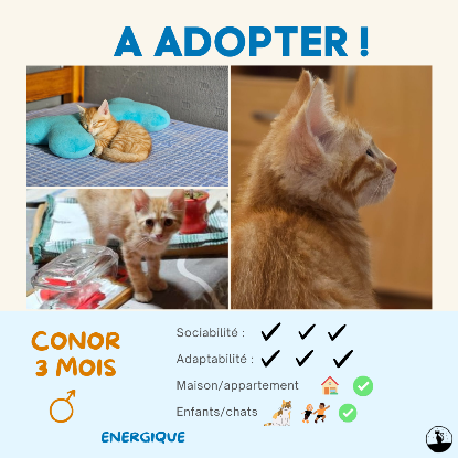 Ne vous fiez pas à l’air calme et sage du petit Conor. Ce petit choux au regard d’amour est une petite boule de vie et d’énergie. C’est un joueur dans l’âme. Tout y passe, car tout est intéressant et drôle pour lui. Les plumes, les bals, les souris, mais aussi les insectes. Il sera votre partenaire de jeux idéal ! Conor a aussi pour lui qu’il est très affectueux, et il a énormément d’amour à offrir.