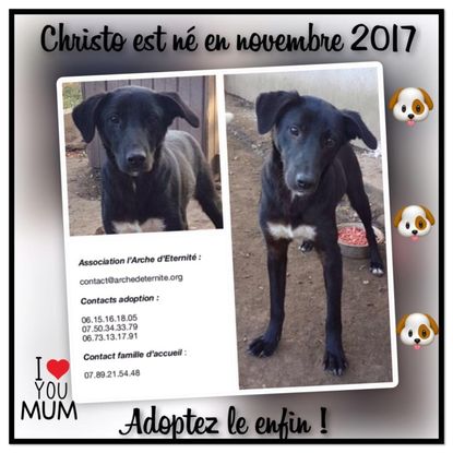 Christo est un chien très sociable mais qui est très timide lorsqu'il ne connait pas les personnes. Il a surtout très peur des hommes. Grace aux friandises Christo finit par vaincre sa timidité, il aura besoin d'une famille patiente et douce pour l'aider à surmonter sa timidité.
