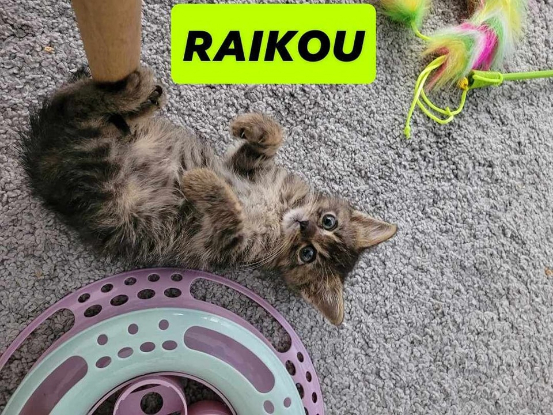 Voici Raikou, un charmant chaton tigré prêt à être adopté aux alentours du 20 juillet ! Timide au premier abord, Raikou n'est jamais en reste lorsqu'il s'agit de suivre ses frères dans leurs aventures. Il adore les câlins et s'endort paisiblement au son des berceuses ou de la musique douce. Si vous recherchez un compagnon tendre et affectueux, Raikou est le chaton idéal pour vous.