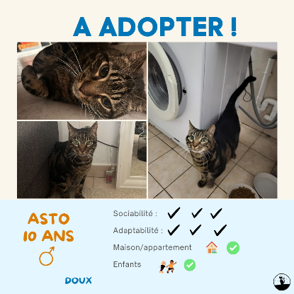 Vous vous demandez certainement comment Asto, 10 ans et aussi beau peut-il être à l’adoption ? Au décès de sa maîtresse, Asto a été laissé pour compte dans l’appartement. Les enfants de sa maîtresse ne voulaient pas le garder, ils allaient l’abandonner dans la rue. Nous lui avons éviter ce terrible sort. Et vous allez le voir, Asto mérite une belle vie ! Il est un chat incroyablement doux, discret et sage. Aussi sage qu’une image, il aime faire des clins d’œil et des ronrons à ses humains. Son occupation principale : faire des câlins. C’est un chat aussi doux qu’un agneau !