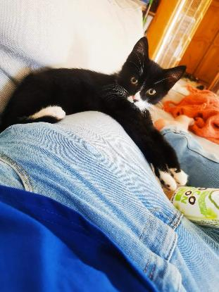 Chaussette est un jeune chaton male, noir et blanc , avec le bout des pattes blanches d’où son prénom , très câlin, en recherche de présence humaine , une vraie machine à ronronner.