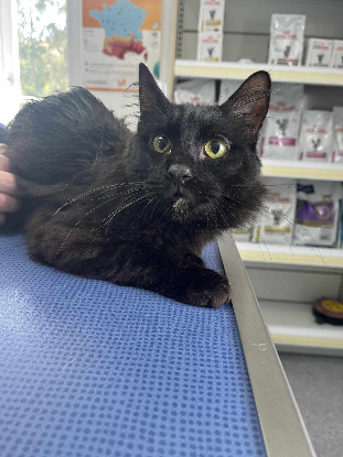 Kouros, est un mâle noir d'environ 2 ans à poils mi-longs récemment sorti d'un logement insalubre avec 7 autres chats.
