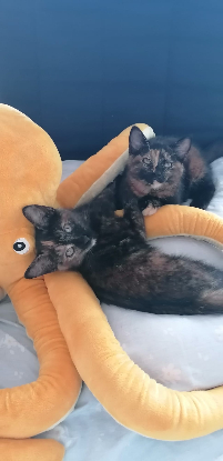 Voici les 2 minettes que nous avons rebaptisées Opale (tâche beige sur œil) et Olympie (tache beige sur le nez)...