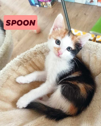 Spoon est une superbe chatonne tricolore, qui tient son beau pelage roux, blanc et noir de sa mère. D'une nature plutôt tranquille, elle exprime cependant son caractère flamboyant dès lors qu'il s'agit de se battre avec ses frères et soeurs et de leur mettre la pâtée ou bien de grimper sur vos genoux telle une conquérante. Déterminée mais douce, elle viendra s'assoir devant vous en vous regardant de ses grands yeux pour quémander une friandise ou un jouet.