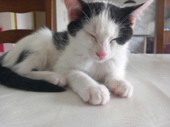 Artémis, notre petite minette noire et blanche, telle la déesse de la chasse est la plus bagarreuse, elle n'hésite pas à aller chercher ses sœurs pour jouer ou les humains pour faire des câlins ! ? Elle est très dégourdie et aimera explorer son environnement avant de revenir vers vous pour se poser un peu !