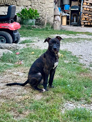 Van est un jeune mâle de 4 mois ( 16/03/24). Il est croisé, typé Dogue, de couleur bringé marron foncé et devrait faire au moins 25 kg à l’âge adulte.