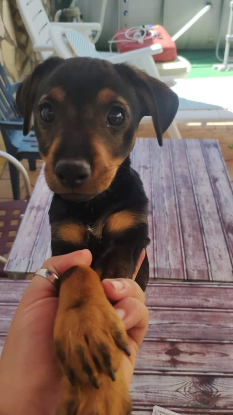 ZEUS est un jeune mâle croisé pinsher et ? - de taille petite à moyenne (poids actuel 4,1 kg) - 3 mois environ - né le 29 avril 2024 -