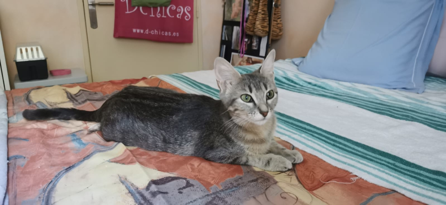 Némésis, une petite chatte , type Européen, Tabby tigré bleu, poil court, identifiée, vaccinée, elle sera stérilisée avant l'adoption