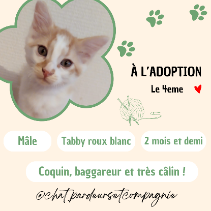Le 4eme a été trouvé dans la rue avec ses 3 frères et sœurs et sa maman. Il a été soigné pour le coryza et déparasité. Il sera bientôt identifié, stérilisé et vacciné ! La maman a été testée négative FIV FELV.
