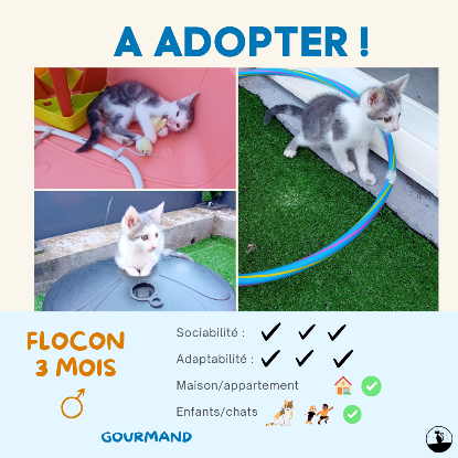 Venez rencontrer Flocon, cet amour de chaton. Ce petit ange porte la joie sur son joli minois. Il n’en manque jamais une pour faire rigoler ses humains ! Il adore jouer, courir, sauter, grimper. La bagarre avec ses frères et soeurs aussi c’est très amusant ! Flocon a l’âme d’un chaton, il porte en lui toutes les qualités du monde : câlin, joueur et surtout… gourmand. Flocon ne ratera jamais une occasion pour avoir une friandise, un peu de pâtée.