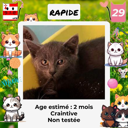 Rapide, femelle de 2 mois craintive (un comportement normal en fourrière) qui vous attend dans une fourrière du 29. ATTENTION SORTIE AU PLUS TARD LE 9/08/2023 (avant euthanasie) !