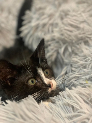 Gentille petite chatte timide née le 08/05/24 noir et blanc qui a besoin d'une famille calme sans enfants en bas age.