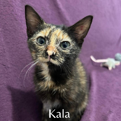 Kala, la petite femelle est un chaton sociable, joueuse mais plus calme et indépendante que son frère. Elle aime aussi beaucoup les séances de câlins partagés avec ses tatas