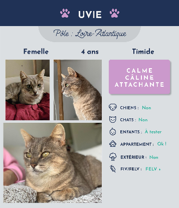 Bonjour ! Moi c'est Uvie, une chatoune câline et très attachante.