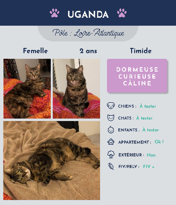 Je suis une petite joueuse, mais au début j’ai très très peur de l’humain ; je me cacherai n’importe où je peux, j’aurais besoin de BEAUCOUP de patience… mais cela rendra les victoires encore plus belles car, après un temps d’adaptation, je deviendrais affectueuse, je ronronne à vos caresses, je me coucherais avec vous, j’accepte même des fois des bisous !