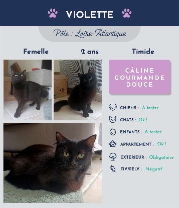 Coucou, je m'appelle Violette, je suis une belle et jeune timide d'environ 2 ans. Au premier abord, je suis un peu craintive, mais avec le temps, je prends confiance et demande des caresses, j'adore ça ! J'anime beaucoup de discussions avec mes petits mais également avec mes deux mamans d’accueil, on se comprend très vite ! Je suis une addict aux p'tits suisses (avec modération), au jambon, et j'apprécie les endroits calmes. Je connais très bien la litière, je peux me permettre de dire que je suis irréprochable ! Admirer l'extérieur est mon activité principale, je souhaiterais une famille avec un jardin pour gambader. J'aimerais également, dans l'idéal avoir un copain chat puisque j'aime beaucoup jouer. Il me faudra surtout une famille douce et à mon écoute.