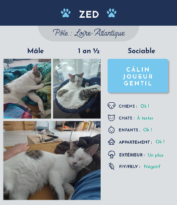 Je m’appelle Zed et je suis un jeune chat d’1 an et ½ environ.