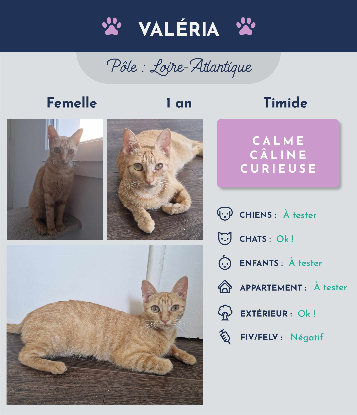 Je m'appelle Valéria, je suis une belle minette rousse timide et calme. Je me cacherai sûrement en arrivant chez vous car j'ai besoin d'un peu de temps dans un nouvel environnement mais par la suite, je viendrai me frotter à vos jambes. J'aime les caresses, ça me fait ronronner de bonheur ![]()