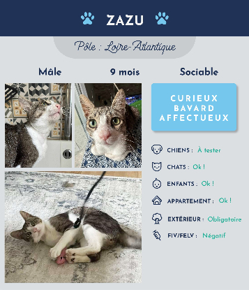 ), j'ai tellement d'aventures à vous raconter ! Je suis super propre, et je regarde beaucoup par la fenêtre ce qu'il se passe, je pense que j'aimerais bien retourner dehors car ça me manque. Quand j'ai vu le vétérinaire, j'avais un coryza donc il m'a injecté un antibiotique et il m'a dit que ça devrait vite aller mieux. J'ai super hâte de trouver ma famille pour la vie, je suis sûr que je pourrais être copain avec d'autres chats s'il y en a. N'hésitez pas à venir me rencontrer !