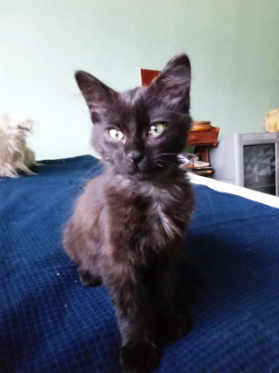Lutin est un adorable chaton d'environ 3 mois, noire, avec les poils mi-long avec petite tache grise sous le cou.