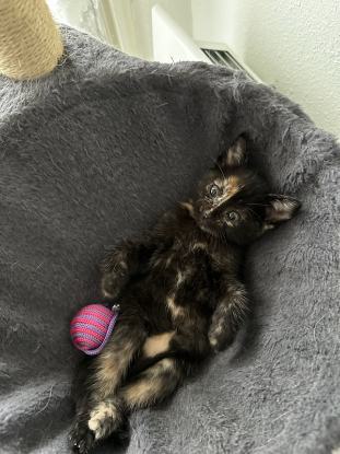 "très joueuse, mais aussi très demandeuse de câlin et d’attention, encore un peu de travail car elle ne boit pas pour l'instant donc pâtée régulièrement pour l'hydrater.