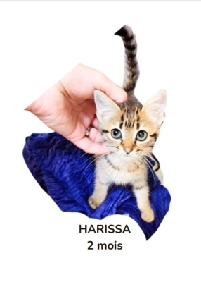 Harissa est une petite chatonne de 2 mois toute mignonne. Elle adore les câlins, elle est très joueuse et curieuse. Elle adore parler surtout quand elle a faim