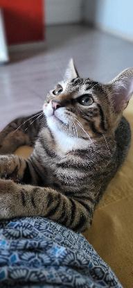 Timide au 1er abord, il se révèle etre une vraie machine a ronron. Il adore les calins. Il est curieux, joueur et tres gentil