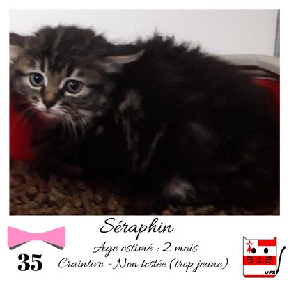 URGENCE EUTHANASIE ! Seraphin est une femelle de 2 mois craintive (un comportement normal en fourrière) qui vous attend dans une fourrière du 35. ATTENTION SORTIE AU PLUS TARD LE 26/06/2020 (avant euthanasie) ! Pour adopter, c'est facile : ➡️ On se rend sur la page facebook d'Urgence Fourrière de Bretagne (UFB) -> https://www.facebook.com/sosfourrieresbreizh/ ➡️ On vient en message privé sur la page UFB ➡️ On remplit le questionnaire ➡️ Si le questionnaire est validé, on se rend disponible pour la pré-visite ➡️ On se rend aussi disponible pour venir chercher le loulou en fourrière Les chats sortent de fourrière primo-vaccinés et identifiés. Restera à charge de l’adoptant le rappel de vaccin et la stérilisation qui est OBLIGATOIRE. Les femelles en fourrière ayant été trouvées dans la rue, il y a fort à parier que nombre d'entre elles en âge de l'être soient gestantes ... ---- A PROPOS D'URGENCE FOURRIERE DE BRETAGNE (UFB) Nous sommes un COLLECTIF d'ASSOCIATIONS DE PROTECTION ANIMALE (qui rassemble notamment Moustaches et Compagnie, Bêtes de Scène, les Pachas, Chats Libres de Berné, etc, etc....) Le BUT de ce collectif d'associations est donc de SORTIR ces animaux des fourrières surchargées en les faisant ADOPTER de manière LEGALE par des familles ou en leur trouvant des FAMILLES D'ACCUEIL lorsque des places en association se libèrent.
