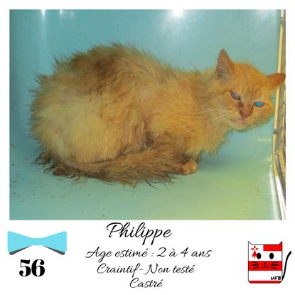 URGENCE EUTHANASIE ! Philippe est un mâle de 2-4 ans craintif (un comportement normal en fourrière) qui vous attend dans une fourrière du 56. ATTENTION SORTIE AU PLUS TARD LE 26/06/2020 (avant euthanasie) ! Pour adopter, c'est facile : ➡️ On se rend sur la page facebook d'Urgence Fourrière de Bretagne (UFB) -> https://www.facebook.com/sosfourrieresbreizh/ ➡️ On vient en message privé sur la page UFB ➡️ On remplit le questionnaire ➡️ Si le questionnaire est validé, on se rend disponible pour la pré-visite ➡️ On se rend aussi disponible pour venir chercher le loulou en fourrière Les chats sortent de fourrière primo-vaccinés et identifiés. Restera à charge de l’adoptant le rappel de vaccin et la stérilisation qui est OBLIGATOIRE. Les femelles en fourrière ayant été trouvées dans la rue, il y a fort à parier que nombre d'entre elles en âge de l'être soient gestantes ... ---- A PROPOS D'URGENCE FOURRIERE DE BRETAGNE (UFB) Nous sommes un COLLECTIF d'ASSOCIATIONS DE PROTECTION ANIMALE (qui rassemble notamment Moustaches et Compagnie, Bêtes de Scène, les Pachas, Chats Libres de Berné, etc, etc....) Le BUT de ce collectif d'associations est donc de SORTIR ces animaux des fourrières surchargées en les faisant ADOPTER de manière LEGALE par des familles ou en leur trouvant des FAMILLES D'ACCUEIL lorsque des places en association se libèrent.
