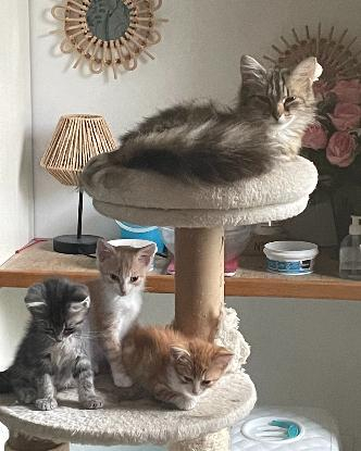 Notre jolie Prunelle est une jeune chatte d’un an qui a été abandonnée et est devenue maman un peu trop tôt.
