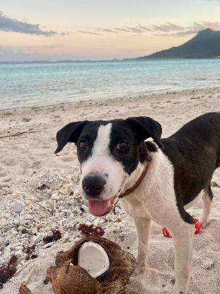 Sa famille d'accueil à Moorea a fait un travail exceptionnel : Domino est devenu très douce, obéissante, et elle apprécie la compagnie des humains ainsi que des autres animaux (chiens et chats).