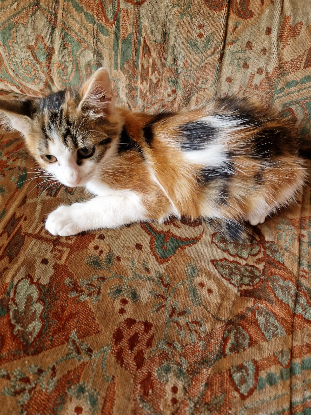 Je m'appelle Vanda. Je suis un petit chaton femelle de 2 mois et demi. Je suis sociable et joueuse. Je suis en famille d'accueil avec mes deux frères, Vince et Vance.