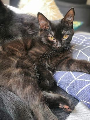 Quintie, la plus timide de la fratrie des 4 blacks. Joueuse, câline et curieuse. Elle a besoin de patience, de douceur. Une fois qu’elle est en confiance elle est au top Elle adore Catsby le chat de sa famille d'accueil donc ok chat Elle ne sera pas épanouie avec des enfants : de grands ados oui mais pas de jeunes enfants ou d'enfants turbulents.