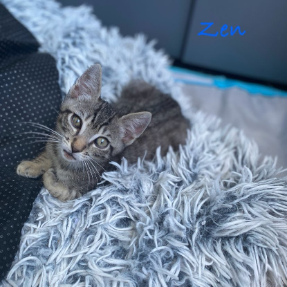 Zen 2 mois et demi à réserver est un chaton doux et très gentil . Sociable avec tout le monde , il fait sa petite vie . Il peut être adopté seul en ayant beaucoup d’attention , ayant grandi entouré de copains et de câlins. Ok chiens, chats, lapins. Il pourra quitter l'association mi septembre et sera alors identifié, primo vacciné, castré et dépisté fiv / felv. Frais d'adoption 170€. En accueil à Véretz, 37.