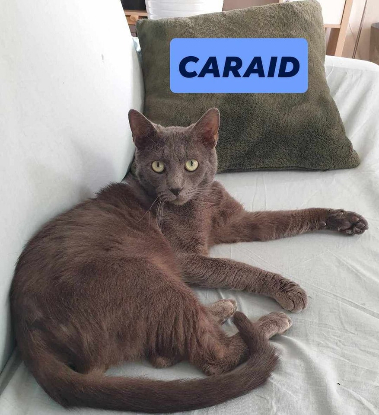 Nous vous présentons Caraid, qui signifie "ami" en gaélique, un beau chat bleu aux yeux étincelants. Malgré son abandon, c'est un chat bien dans ses pattes, propre et qui explore aisément son environnement !