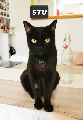 STU est un chat de 4 ans plutôt calme qui aime chantonner pour accueillir son maître et faire des roulades au sol au moment du repas.