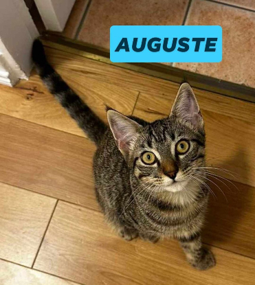 Auguste est un petit chaton tigré absolument adorable. Il aime alterner son temps entre gros câlins et temps de jeu. Vous le trouverez souvent sur vos genoux lors de séances télé, et il saura vous bercer avec son ronronnement au moment d’aller au lit. Également espiègle, il aime se cacher dans des endroits improbables, tels que les tiroirs et le bac à linge. Il essayera de vous attendrir avec son tout petit miaulement, mais attention à ne pas laisser trainer lacés, mèches de cheveux ou cordons, car il en fera son quatre-heures ! Il est très sociable, s’adapte vite aux nouveaux endroits et au nouveaux humains.