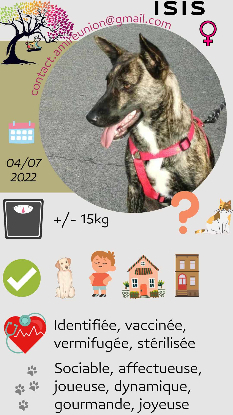 Isis est un cœur sur pattes qui a énormément besoin d'interagir avec les humains qu'elle adore particulièrement, mais aussi avec ses congénères qui sont de bons copains de jeux!