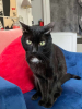 C' est un adorable jeune chat noir avec une petite tache blanche sous le menton.