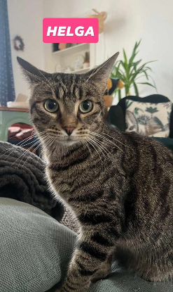 HELGA est une femelle de 3 ans tigrée marron avec de grands yeux verts.